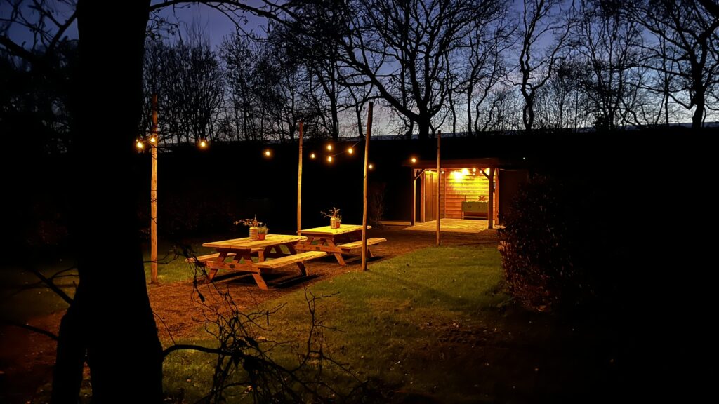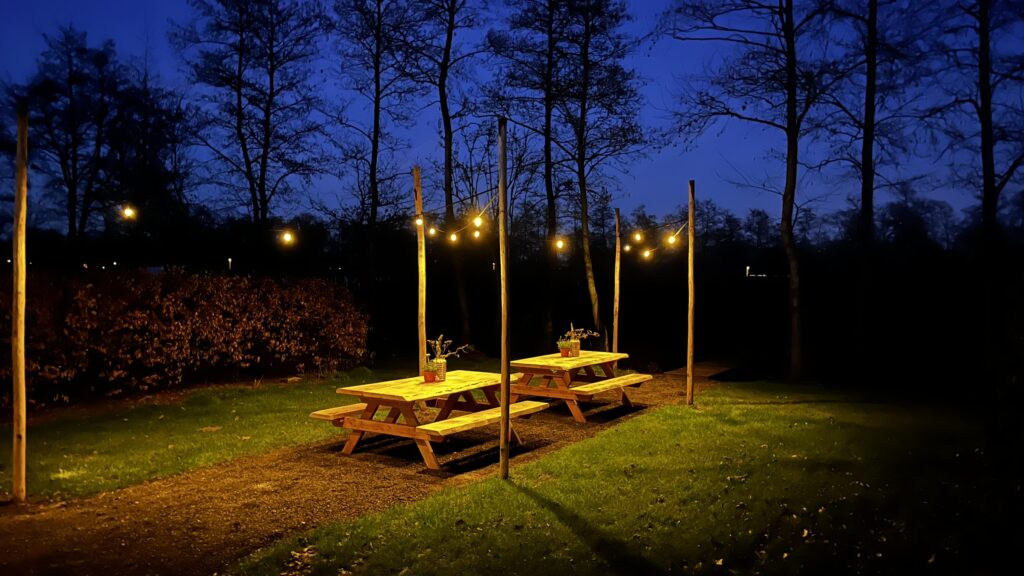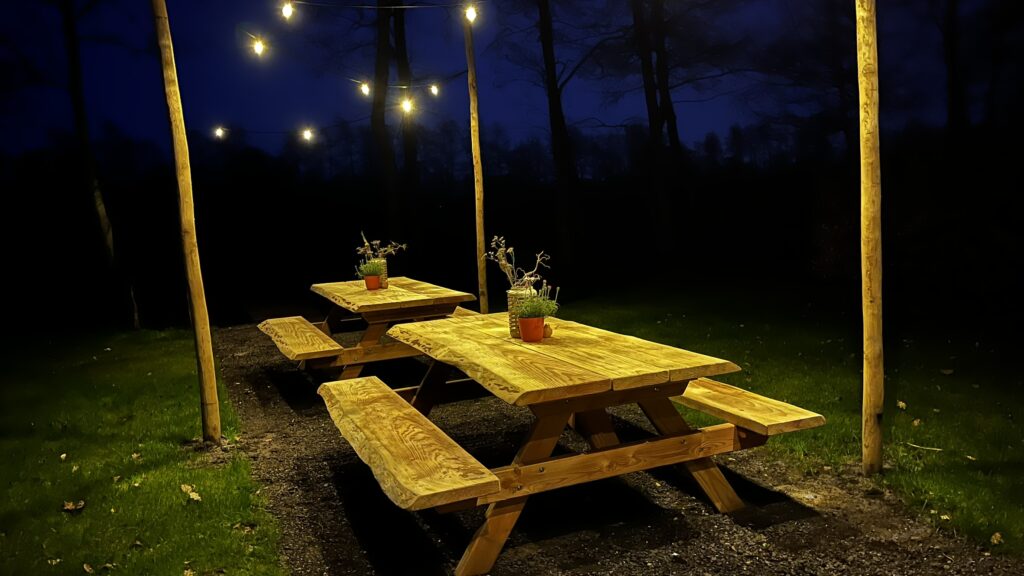 In het midden van ons terrein hebben wij twee picknick tafels staan, die gebruikt mogen worden door iedereen. Hier kun je samen met andere campinggasten genieten van een bakje koffie of thee of ’s avonds tijdens zonsondergang van een borrel. 🌻
