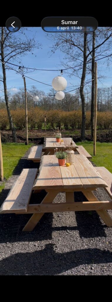 In het midden van ons terrein hebben wij twee picknick tafels staan, die gebruikt mogen worden door iedereen. Hier kun je samen met andere campinggasten genieten van een bakje koffie of thee of ’s avonds tijdens zonsondergang van een borrel. 🌻